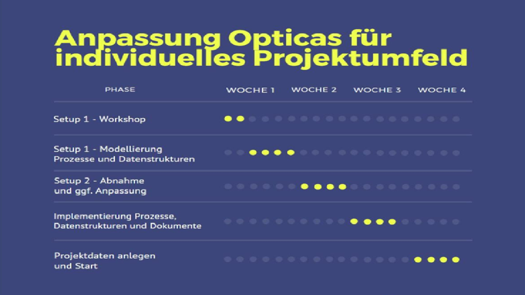 OPTICAS ist eine webbasierte und unmittelbare einsetzbare Plattform für beliebig viele Projektbeteiligte. Das vorgesehene Projekt erfordert eine Prozessdefinition und die Festlegung des Ablaufs.